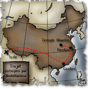 Under the philosophical influence of Buddhism, Taoism and Confucianism, two great Schools were created : that of Shaolin and Wu Tang. The first is buddhist and the second is taoist. The buddhist School dates back to the sixth century A.D., well before its taoist counterpart which appeared in the eleventh century. The arrival of the learned Indian buddhist monk Bodidharma at the Shaolin Temple marks the beginning of Shaolin Kung Fu. Born in 483 A.D., the third son of a brahman king of the Sardili clan, well educated according to his time, he was proficient in the arts, politics, sutras and warfare. He was not quite thirty when he left the princely comforts to dedicate his life to attaining enlightenment.Having become a reputable monk, he went to China to propagate the teachings of Buddha as had done many of his Indian predecessors during the era of the Three Kingdoms. Welcomed at the Kuan Temple in the province of Guangdong (Canton) toward 527 A.D., the Governor of Guangdzou recommended Bodidharma, alias Tamo, to Emperor Liang Wu. Legend reports that the Emperor did not appreciate Tamo’s discourse, making but a brief stay in Nanking.